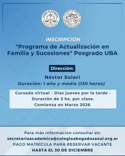 Se abrió la inscripción al Posgrado UBA en Familia y SucesionesEl Colegio de Abogados de Azul invita a participar del Posgrado UBA – Programa de Actualización en Familia y Sucesiones, dirigido por el Dr. Néstor Solari. LEER MÁS |