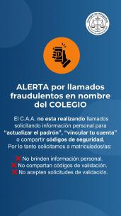 Alerta por llamados fraudulentos en nombre del ColegioEl C.A.A. no esta realizando llamados solicitando información personal para “actualizar el padrón”, “vincular tu cuenta” o compartir códigos de seguridad. Por lo tanto solicitamos a matriculados/as no brindar información personal, compartir códigos de validación ni aceptar solicitudes de validación. LEER MÁS |