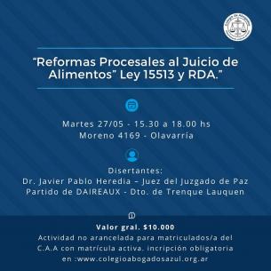 Capacitación sobre Reformas Procesales al Juicio de Alimentos en OlavarríaSe trata de la segunda edición de la capacitación, ya que la primera se realizó el pasado 13 de mayo en Tandil. En esta oportunidad, se realizará en la Subsede Olavarría el 27 de mayo a las 15.30 hs. Quienes deseen participar deberán inscribirse previamente. LEER MÁS |