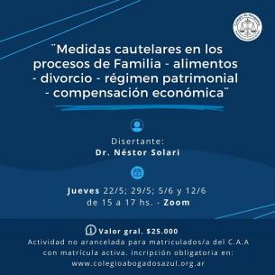 El Colegio organizó una jornada de actualización sobre medidas cautelaresSe trata de una jornada sobre medidas cautelares en procesos de familia, alimentos, divorcio, régimen patrimonial y compensación económica. Estará a cargo del Dr. Néstor Solari y comenzará el próximo 22 de mayo. Se extenderá por un total de 4 encuentros en modalidad virtual. LEER MÁS |