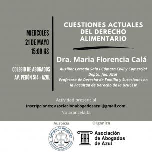 Se realizará una charla sobre cuestiones actuales del derecho alimentarioLa actividad es organizada por la Asociación de Abogados de Azul y tendrá lugar el próximo 21 de mayo en la Sede del Colegio. Estará a cargo de la Dra. Maria Florencia Calá. LEER MÁS |