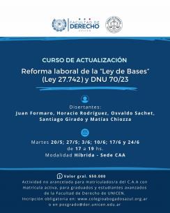 Se realizará un curso de actualización sobre la Ley Bases y el DNU 70/23Contará con la disertación de destacados referentes, quienes dialogarán con las/os presentes sobre la temática. Comenzará el 20 de mayo y se extenderá hasta el 24 de junio en un total de 6 encuentros. LEER MÁS |