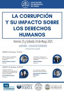 Encuentro sobre corrupción y su impacto sobre los derechos humanosSe realizará en 2 jornadas: 23 y 24 de mayo a las 17 hs y a las 10 hs, respectivamente en el Colegio de Escribanos. Contará con la presencia de importantes referentes de la temática que participarán de la mesa. LEER MÁS |
