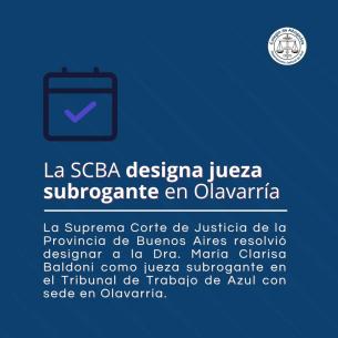 La SCBA designa jueza subrogante en OlavarríaLa Suprema Corte de Justicia de la Provincia de Buenos Aires resolvió designar a la Dra. María Clarisa Baldoni como jueza subrogante en el Tribunal de Trabajo de Azul con sede en Olavarría. Esta decisión, oficializada mediante la Resolución RSC-990-2025, responde a la vacante existente desde 2019 tras la renuncia de la Dra. Liliana Galarza. LEER MÁS |