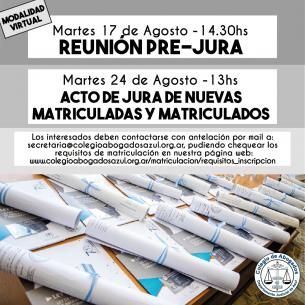 Reunión Pre-Jura y Acto de Jura de nuevas matriculadas y matriculadosAmbas actividades se realizarán con modalidad virtual. El martes 17/08 a las 14.30hs se realizará la reunión Pre-Jura. Las abogadas y abogados interesados en matricularse deben contactarse con anticipación, por mail a: secretaria@colegioabogadosazul.org.ar, pudiendo chequear los requisitos de matriculación haciendo click aquí LEER MÁS |