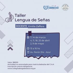 Nueva edición del Taller de Lengua de SeñasEl Colegio de Abogados del Departamento Judicial de Azul en colaboración con la Facultad de Derecho de la UNICEN ha organizado un taller que comenzará el 7 de marzo en la sede del C.A.A. a partir de las 15 horas y estará a a cargo de Emilia Zaffora. LEER MÁS |
