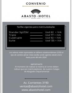 Importantes beneficios en alojamiento en el Abasto Hotel Buenos AiresA partir de la firma de este convenio, matriculados/as del C.A.A. podrán contar con la posibilidad de acceder a descuentos especiales al momento de alojarse en las instalaciones del Abasto Hotel Buenos Aires. LEER MÁS |