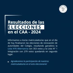 Se realizaron las elecciones en el CAAFinalizado el escrutinio para la elección de renovación de autoridades, se informa a las y los matriculados que resultó ganadora la Lista Nro 8 Alternancia con un total de 353 votos frente a los 279 votos obtenidos por la Lista Nro 1 Integración. Agradecemos a quienes se acercaron a emitir su voto y participar activamente de la elección. LEER MÁS |