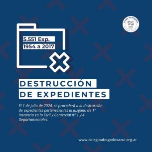 Información importante sobre destrucción de expedientesEl 1 de julio a la 8 hs se procederá a la destrucción de 5.551 expedientes iniciados entre los años 1954 a 2017 con plazos de guarda cumplidos. LEER MÁS |