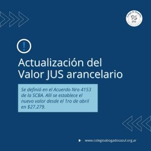Actualización del JUS aplicable a abril de 2024Se definió en el Acuerdo Nº 4153 de la SCBA. Allí se establece el nuevo valor desde el 1ro de abril en $27.279. También se establece la readecuación del Jus arancelario decreto-ley 9804/77 en $18.642. LEER MÁS |