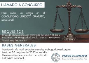 Finaliza hoy el llamado a concurso para Consultorio Jurídico GratuitoEl Colegio de Abogados del Departamento Judicial de Azul llama a concurso para cubrir un cargo para el CONSULTORIO JURÍDICO GRATUITO en la subsede ubicada en la ciudad de TANDIL. LEER MÁS |