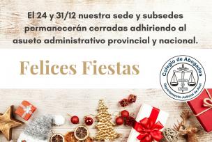 Asuetos administrativos en virtud de las celebraciones de navidad y año nuevoEl 24 y el 31/12 nuestra sede y subsedes permanecerán cerradas adhiriendo al asueto administrativo provincial y nacional. LEER MÁS |