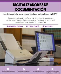 Digitalizadores de documentaciónEsta eficiente herramienta, sin costo para las matriculadas y matriculados del CAA, permite digitalizar documentos convirtiéndolos automáticamente en formato .pdf (el más adecuado para cargar en la web). LEER MÁS |