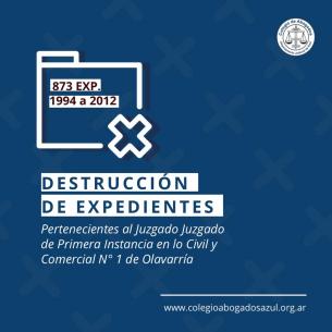 Destrucción de expedientes en el Juzgado de Primera Instancia en lo Civil y Comercial Nro. 1 de OlavEl 8 de septiembre se procederá a la destrucción de 873 expedientes iniciados entre los años 1994 y 2012 con plazos de guarda vencidos autorizado por Resolución SCBA (Expte. Nro. 3001-30534-2022). El material ya ha sido revisado por el Departamento Histórico Judicial de la Suprema Corte conforme arts. 116, 118 del Ac. 3397 y Ac. 1934. El listado de causas a destruir se encuentra a disposición en archivo adjunto. LEER MÁS |