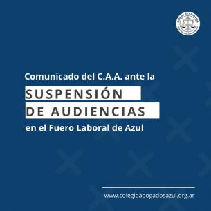 Comunicado del C.A.A. ante la suspensión de audiencias en el Fuero Laboral de AzulEl Colegio de Abogados del Departamento Judicial de Azul manifiesta su preocupación por la situación que padece el Tribunal del Trabajo de la localidad de Azul, ante la falta de integración de magistrados que lo componen, desde hace más de tres años. LEER MÁS |