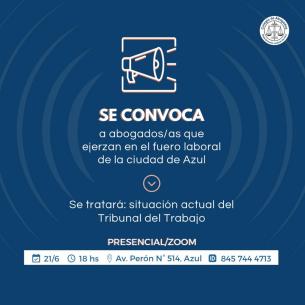 Convocatoria a reunión con los/as abogados/as que ejercen en el Fuero Laboral de AzulSe realizará a las 18 hs en la Sede del Colegio de Abogados Departamental, ubicado en Av. Perón 514 y se abordará la situación en la que se encuentra el Tribunal de Trabajo. Quienes no puedan acercarse de manera presencial, pueden sumarse utilizando el ID 845 744 4713 LEER MÁS |