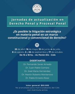 Se acerca un nuevo encuentro de las Jornadas de actualización en Derecho PenalSe realizará el próximo 8 de agosto a las 15 hs en la Sede del Colegio. Recordamos que se trata del espacio formativo que comenzó en abril y se extenderá hasta el mes de octubre. La jornada es gratuita para matriculados y matriculadas con matrícula al día. LEER MÁS |