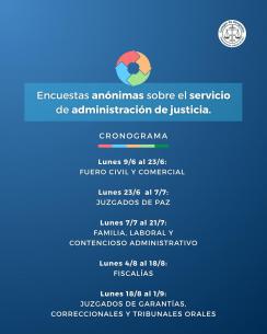 Siguen habilitadas las encuestas sobre el servicio de administración de justiciaHasta el 8 de agosto podrán completar las encuestas de: Fuero Civil y Comercial; Laboral, Familia y Contencioso Administrativo. Luego se habilitarán las encuestas de Fiscalías y Juzgados de Garantías, Correccionales y Tribunales Orales. LEER MÁS |