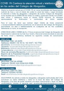 COVID 19: Continúa la atención virtual en la sede y subsedes del CAA.Atento la situación actual por el COVID-19, en varias localidades del Departamento Judicial de Azul, y con el interés de cuidar la salud de todos y seguir brindado la atención a todas las abogadas y abogados de nuestro Colegio de Abogados, se ha resuelto que la ATENCIÓN (en todas sus sedes), continuará siendo con modalidad virtual y telefónica, hasta el viernes 25/09 inclusive. Se informará oportunamente la finalización o continuidad de dicha medida. LEER MÁS |