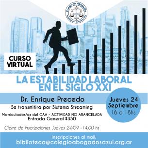 Charla: “La estabilidad laboral en el Siglo XXI”El Dr. Enrique Precedo disertará sobre esta temática el jueves 24/09 de 16 a 18hs, vía streaming. Inscripciones hasta las 14 hs del día 24 /09 por mail: biblioteca@colegioabogadosazul.org.ar LEER MÁS |
