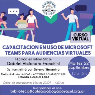 Capacitación en uso de Microsoft Team para audiencias virtualesEl Técnico en Informática Gabriel Alejandro Franchini, explicará como bajar la aplicación y como usarla: en celulares, tablets y computadoras; el martes 22/09 de 15 a 16hs, vía streaming. Inscripciones hasta ese día a las 14hs, por mail: biblioteca@colegioabogadosazul.org.ar LEER MÁS |