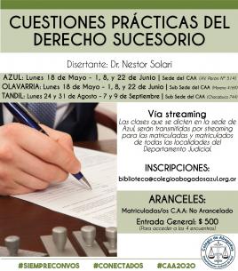 Curso: Cuestiones prácticas del Derecho SucesorioEl Dr. Néstor Solari dictará esta capacitación en Azul, Olavarría y Tandil. Se trata de 4 clases, con modalidad presencial o virtual ya que, aquellas que se dicten en la sede del CAA, se transmitirán por sistema streaming para que abogadas y abogados puedan cursar desde todas las localidades del Departamento Judicial. Es no arancelada para matriculadas y matriculados. Se entregarán certificados de asistencia. Inscripciones: biblioteca@colegioabogadosazul.org.ar LEER MÁS |