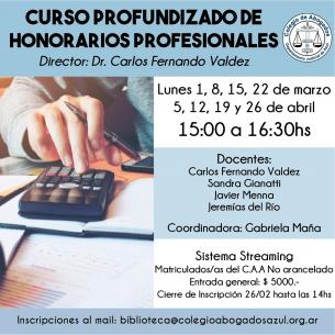 Curso profundizado de Honorarios ProfesionalesDirigido por el Dr. Carlos Fernando Valdez, autor de la obra «Ley de Honorarios de Abogados y procuradores de la Provincia de Buenos Aires, Comentada» (ley 14.967) y con un destacado plantel docente, este curso comenzará el 1 de marzo, dictándose vía streaming durante 8 encuentros los días lunes de 15 a 16.30hs (durante marzo y abril). Inscripciones hasta el 26/02 a las 14hs por mail, a: biblioteca@colegioabogadosazul.org,ar LEER MÁS |