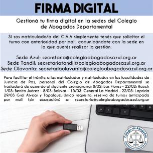 Gestioná tu firma digital en la sedes del Colegio de Abogados DepartamentalSi sos matriculado/a del C.A.A, simplemente tenés que solicitar el turno con anterioridad por mail, comunicándote con la sede en la que querés realizar la gestión. LEER MÁS |