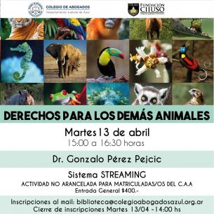 Charla: “Derechos para los demás animales”El Dr. Gonzalo Pérez Pejcic brindará esta capacitación el martes 13/04 de 15 a 16.30 hs vía streaming. Inscripciones hasta ese día a las 14hs por mail a: biblioteca@colegioabogadosazul.org.ar LEER MÁS |