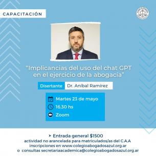 Nueva capacitación sobre el uso del chat GPT en el ejercicio de la abogacíaEl Colegio de Abogados Departamental ha organizado una capacitación sobre las implicancias del uso del chat GPT en el ejercicio de la abogacía que estará a cargo del Dr. Aníbal Ramírez. Se transmitirá el 23 de mayo a partir de las 16.30 hs. LEER MÁS |