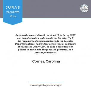 Acto de Jura de nuevas matriculadas y matriculadosEl miércoles 24 de mayo a las 13 hs, con modalidad presencial en la sede de Azul (Av. Perón 514) y transmisión vía YouTube; las autoridades del Colegio de Abogados Departamental tomarán juramento a las abogadas y abogados cuya nómina ponemos en consideración pública. LEER MÁS |