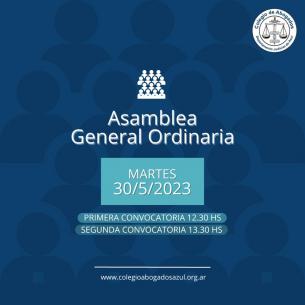 Se realizará la Asamblea General Ordinaria el martes 30/05El Colegio de Abogados del Departamento Judicial Azul informa que se llevará a cabo la Asamblea General Ordinaria el día 30 de mayo del 2023 en la Sede del Colegio de Abogados Departamental, en Av. Perón N°514. LEER MÁS |