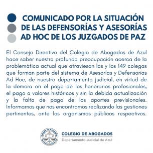 Comunicado por la situación de las defensorías y asesorías ad hoc de los Juzgados de Paz.El Consejo Directivo del Colegio de Abogados de Azul hace saber nuestra profunda preocupación acerca de la problemática actual que atraviesan las y los 149 colegas que forman parte del sistema de Asesorías y Defensorías Ad Hoc, de nuestro departamento judicial, en virtud de la demora en el pago de los honorarios profesionales, el pago a valores históricos y sin la debida actualización y la falta de pago de los aportes previsionales. LEER MÁS |