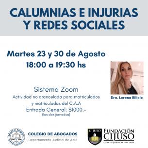 Charla: "Calumnias e Injurias y Redes Sociales"La Dra. Lorena Bilicic disertará sobre esta temática el 23 y 30 de agosto de 18:00 a 19:30 hs, vía sistema Zoom. Esta capacitación, organizada por Fundación CIJUSO y el C.A.A, es no arancelada para matriculadas y matriculados. Podés inscribirte completando el formulario online, haciendo click aquí. LEER MÁS |