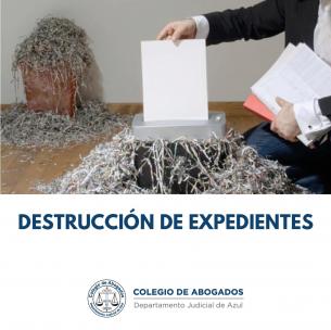 Destrucción de expedientes de distintos JuzgadosEl Archivo Departamental Azul informó que el día 31/08/2022 a las 12.00 hs. se llevarán a cabo destrucciones de 6786 expedientes, en los términos del Acuerdo 3397/08 y Resolución SCBA 2049/12, que fueron aprobadas por Resoluciones Nros. 856/22 y 1609/22 SCBA. LEER MÁS |