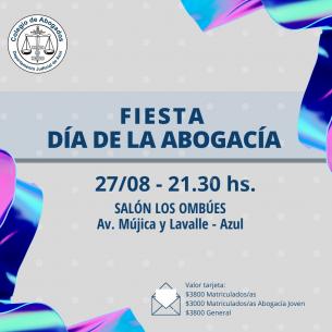 Fiesta Día de la AbogacíaEl próximo sábado 27/08 desde las 21.30hs, te esperamos con DJ, banda en vivo, un variado menú informal, barra libre toda la noche y sorteos para disfrutar juntos este tradicional encuentro. Además agasajaremos a quienes cumplen 25 y 50 años en ejercicio activo de la profesión. LEER MÁS |