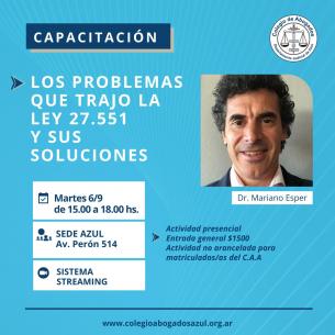 Los problemas que trajo la Ley 27.551 y sus soluciones.El Dr. Mariano Esper disertará sobre esta temática el martes 6 de septiembre de 15 a 18 hs en la sede de Azul (Av. Pte. Perón N° 514). La capacitación es presencial para matriculadas y matriculados de Azul, brindándose vía streaming para profesionales del resto de las localidades del Departamento Judicial. LEER MÁS |