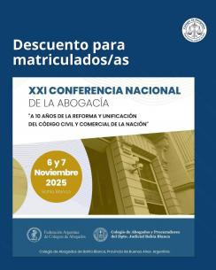 Descuento para matriculados para la asistencia a la Conferencia Nacional de la AbogacíaEl Colegio de Abogados de Azul informa a sus matriculados que quienes deseen participar de la Conferencia Nacional de la Abogacía 2025, organizada por la Federación Argentina de Colegios de Abogados (F.A.C.A.) podrán obtener descuentos en la inscripción al evento. LEER MÁS |