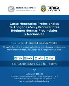 Nuevo curso sobre honorarios profesionales en articulación con la UNLPEl C.A.A. junto con la Facultad de Ciencias Jurídicas y Sociales de la UNLP, organizan el curso “Honorarios Profesionales de Abogadas/os y Procuradores. Régimen Normas Provinciales y Nacionales”. La capacitación estará a cargo del Dr. Carlos Fernando Valdez, abogado, docente y presidente de la Comisión de Honorarios Profesionales del Colegio de la Abogacía de La Plata. El curso comienza el 23 de septiembre y se extenderá hasta el 21 de octubre. LEER MÁS |