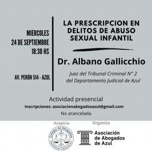 La A.A.A. invita a participar de la charla sobre prescripción en delitos de abuso sexual infantilLa Asociación de Abogados de Azul invita a la charla “La prescripción en delitos de abuso sexual infantil”, que se realizará el miércoles 24 de septiembre a las 18:30 en Av. Perón 514. La disertación estará a cargo del Dr. Albano Gallicchio, juez del Tribunal Criminal Nº 2 del Departamento Judicial de Azul. La actividad es presencial, gratuita y con inscripción previa en: asociacionabogadosazul@gmail.com. LEER MÁS |