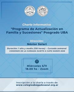 Charla informativa sobre el Programa de Actualización en Familia y SucesionesSe realizará el próximo miércoles 5 de noviembre a 18 hs por Zoom. El posgrado tiene una duración de un año y medio, con cursada semanal, y el inicio de la próxima cohorte está previsto, sujeto a cupo, para marzo de 2026. LEER MÁS |