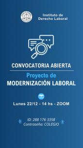 Convocatoria abierta para analizar el Proyecto de Ley de Modernización LaboralA través del Instituto de Derecho Laboral, el Colegio convoca a matriculados/as interesados/as a participar de un encuentro donde se trabajará exhaustivamente en el análisis del proyecto. El encuentro se realizará el próximo lunes 22 de diciembre a las 14 hs en modalidad virtual. Pueden ingresar al Zoom con el ID 288 176 3358 y la clave COLEGIO. LEER MÁS |