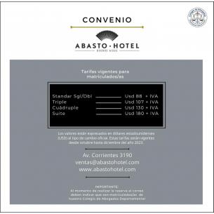 Importantes beneficios en alojamiento en el Abasto Hotel Buenos AiresA partir de la firma de este convenio, matriculados/as del C.A.A. podrán contar con la posibilidad de acceder a descuentos especiales al momento de alojarse en las instalaciones del Abasto Hotel Buenos Aires. LEER MÁS |