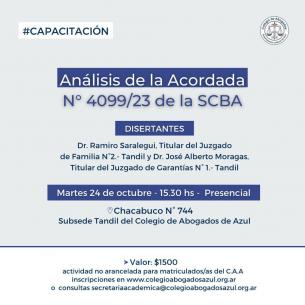 Análisis de la Acordada Nro 4099/23 de la SCBA en TandilEl próximo martes 24 de octubre se realizará un encuentro en la Subsede del Colegio de Abogados Departamental en Tandil (Chacabuco 744) donde se analizará dicha Acordada. LEER MÁS |