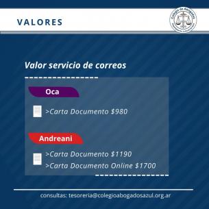 Valores vigentes para el envío de Carta DocumentoMatriculadas y matriculados tiene a disposición en Mesa de Entradas del Colegio de Abogados Departamental, los servicios de correo OCA o Andreani, de acuerdo a su preferencia. LEER MÁS |