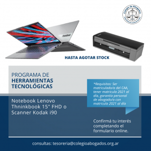 Aprovechá el Programa de Acceso a Herramientas TecnológicasMatriculadas y matriculados del C.A.A interesadas/os pueden renovar su computadora y/o digitalizador en 12 cuotas fijas y en pesos. LEER MÁS |