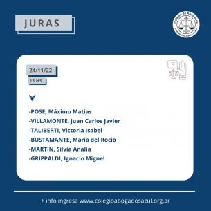 Acto de Jura de nuevas matriculadas y matriculadosEste jueves 24 de noviembre a las 13hs, con modalidad presencial en la sede de Azul (Av. Perón 514) y transmisión vía YouTube; las autoridades del Colegio de Abogados Departamental tomarán juramento a las abogadas y abogados cuya nómina ponemos en consideración pública... LEER MÁS |