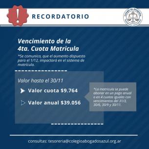 El miércoles 30/11 vence la cuarta cuota de la matrículaLos reajustes en el valor del JUS arancelario (Acordada 4088) impactarán en el sistema el próximo 1 de diciembre, modificando el valor actual de la matrícula. LEER MÁS |