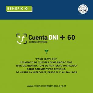 Cuenta DNI +60 de Banco ProvinciaDesde el 1º al 30/11/22, de viernes a miércoles podés aprovechar un 100% de ahorro, con tope de reintegro unificado $1200 por mes y por persona; para el segmento de clientes de 60 años o más con "pago clave DNI". LEER MÁS |