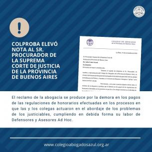 Reclamo de COLPROBA por las demoras en los pagos de las regulaciones de honorariosEL Colegio de Abogados de la Provincia de Buenos Aires elevó nota al Ministro de Hacienda y Finanzas de la Provincia de Buenos Aires Lic. Pablo Julio López y al Sr. Procurador General de la Suprema Corte de Justicia de la Provincia de Buenos Aires, Dr. Julio Conte Grand. LEER MÁS |